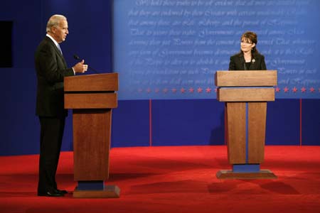 Democratic vice presidential nominee Senator Joe Biden (D-DE) (L) and Republican vice presidential nominee Alaska Governor Sarah Palin appear onstage during the vice presidential debate at Washington University in St. Louis, Missouri October 2, 2008.[Agencies]
