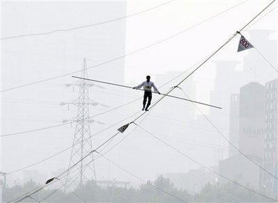 Yakefujiang Maimitili, competing Friday on the second day of the three-day contest, beat 26 other competitors in traversing the three-quarter-mile-long wire to claim the $20,000 prize. Colombia's Alan Martinez came in second place with a time of 11 minutes, 23 seconds. Last year's winner, Abudusataer Wujiabudula of China, finished in 11 minutes, 28 seconds, for third place. Maimitili, 20, said he has been a tightrope walker since the age of 7, following in his ethnic Uighur family's tradition in his native Xinjiang in northwestern China. "I was really excited while I was walking on the rope," Maimitili said Saturday. Tightrope walking is also a Korean tradition going back centuries, with performers often leaping and turning somersaults in midair, and sometimes even cracking jokes, to entertain onlookers. A 2005 film, "The King and the Clown," which featured a troupe of entertainers who became court jesters, rejuvenated interest in the Korean tradition. Organizer Kwon Won-tae, a professional tightrope walker who did the stunt work in the film, also competed this week. He credited the competition with keeping the tradition of tightrope walking alive, and said he hopes to eventually compete in North Korea. "Sometime in the future, I want to hold this high-wire championship across the Taedong River in Pyongyang," he said Saturday. |