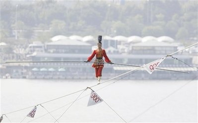 No one needed the safety net slung under the wire. Colombia's Marcos Luis Martinez lost his balance at one point but caught himself and managed to run across. "I am so proud of myself to finish my performance on the single-strand wire," he said. Ayaixiguli Maimitili, who said she came from China to watch six fellow Uighurs compete in Seoul, including the winner, decided to try her hand at crossing the tightrope, with bowls on her head. "Traditionally, Uighur women put bowls on their head to keep their balance," she said. The competitors hailed from 14 countries, including Tino Wallenda and his daughter Aurelia of the "Flying Wallendas" high-wire act. Onlookers later had the chance to try walking a shorter tightrope, not as high up, themselves. "I felt nervous and cool at the same time," said tourist Kai Schneider, 22, from Germany. |
