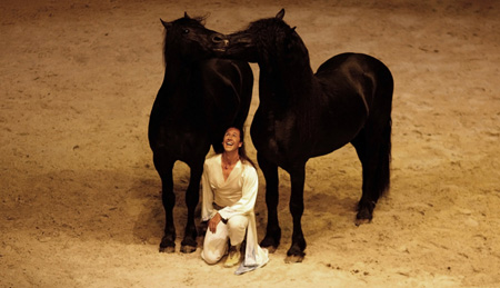 Trainer and equestrian co-director Frederic Pignon performs with his horses during the equestrian show "Cavalia" in Lisbon October 5, 2008. "Cavalia" was created by Normand Latourelle, one of the founders of Cirque du Soleil. [Agencies]
