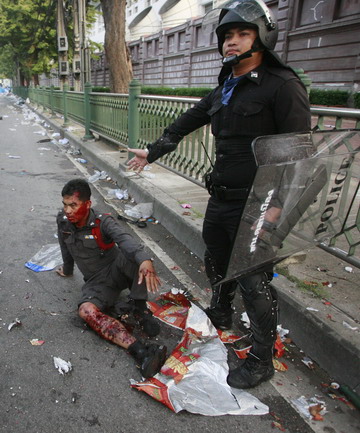 A policeman sits by the side of the road after being injured during clashes with anti-government demonstrators outside Parliament in Bangkok on October 7, 2008. Police fired tear gas at several thousand demonstrators attempting to block lawmakers' access to parliament, heating up a political crisis that has gripped the country for six weeks and led to the resignation of the deputy prime minister on Tuesday. [Agencies]
