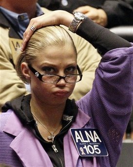 Trader Alana Muschong gestures as she works in the S&P 500 futures trading pit at the CME Group in Chicago, Tuesday, Oct. 7, 2008. The misery worsened on Wall Street Tuesday, with stocks piling on the losses late in the session and bringing the two-day decline in the Dow Jones industrials to more than 875 points amid escalating worries about credit markets and financial sector. The Standard & Poor's 500 index declined 60.66, or 5.74 percent, to 996.23. [Agencies] Dow Jones dives again, credit worries linger