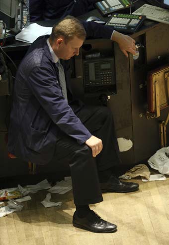 Updated: 2008-10-08 10:26 A trader works on the floor of the New York Stock Exchange, October 7, 2008. US stocks slid on Tuesday as a sell-off in financial shares accelerated and fears mounted that the rapidly spreading credit crisis would drag the economy into recession. [Agencies] Dow Jones dives again, credit worries linger