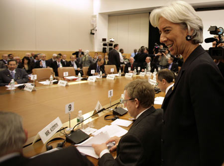 France's Finance Minister Christine Lagarde arrives at the International Monetary and Financial Committee meeting during the annual IMF-World Bank meeting in Washington October 11, 2008. Finance leaders from the IMF's 185 member countries on Saturday endorsed a plan announced by major economies to chart a course out of the credit crisis. [Agencies]