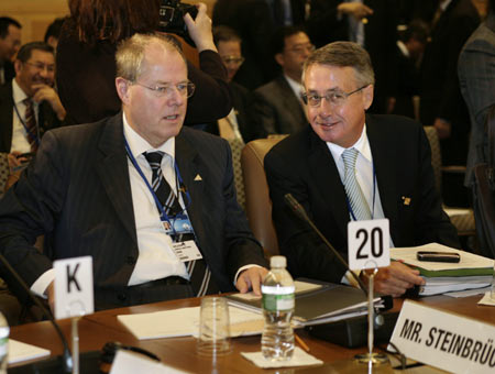 Australia's Treasurer Wayne Swan (R) talks to Germany's Finance Minister Peer Steinbruck at the International Monetary and Financial Committee meeting during the annual IMF-World Bank meeting in Washington October 11, 2008. Finance leaders from the IMF's 185 member countries on Saturday endorsed a plan announced by major economies to chart a course out of the credit crisis. [Agencies]