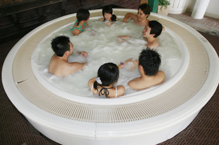 Tourists take a bathe in a bathtub filled with heated soy milk in a spa resort in Hakone Kowakien Yunessun, a mountainous hot spring town in Japan, October 12, 2008. The "soy milk spa" service was offered in honor of Japan's "Soy Milk Festival". [Xinhua]