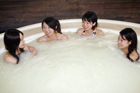 Tourists take a bathe in a bathtub filled with heated soy milk in a spa resort in Hakone Kowakien Yunessun, a mountainous hot spring town in Japan, October 12, 2008. The "soy milk spa" service was offered in honor of Japan's "Soy Milk Festival". [Xinhua]