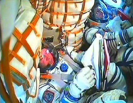 Updated: 2008-10-12 16:45 ![]() Expedition 18 Commander Mike Fincke (L) works next to Expedition 18 Flight Engineer Yuri Lonchakov during their launch aboard a Soyuz spacecraft from the Baikonur Cosmodrome in Kazakhstan October 12, 2008. US business tycoon Richard Garriott, a video game developer from Texas, paid US$35 million to fly into space alongside US Astronaut Fincke and Russian cosmonaut Lonchakov. [Agencies]