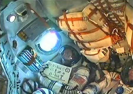 Updated: 2008-10-12 16:45 ![]() US space tourist Richard Garriott (L) looks out of a window as Expedition 18 Flight Engineer Yuri Lonchakov works during their launch aboard a Soyuz spacecraft from the Baikonur Cosmodrome in Kazakhstan October 12, 2008. Garriott, a video game developer from Texas, paid US$35 million to fly into space alongside US astronaut Michael Fincke and Russian cosmonaut Lonchakov. [Agencies]