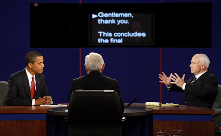 A message appears on the teleprompter as US Democratic presidential nominee Sen. Barack Obama (D-IL) (L) and Republican presidential nominee Sen. John McCain (R-AZ) (R) conclude their presidential debate at Hofstra University in Hempstead, New York October 15, 2008. [Agencies]
