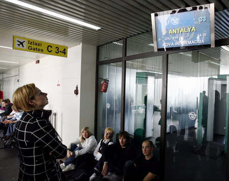 Passengers of a Boeing 737-800 belonging to the German company XL Airways rest at Nikola Tesla Airport in Belgrade October 18, 2008. A plane carrying 169 people on a flight from Germany to Turkey made an emergency landing at Belgrade on Saturday after an engine failure, an aviation official said. A spokesman for Belgrade airport said the Boeing 737-800 with 163 passengers and six crew on board made an emergency landing at 7:47 a.m. [Agencies]
