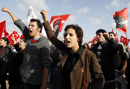 Updated: 2008-10-21 10:37 Some 1,500 people gathered outside the courthouse in support of the defendants, holding Turkish flags and portraits of the suspects. They shouted slogans against the government as well as the United States and the European Union, reflecting the nationalist feeling of many Turks that outside influences seek to undermine their country.