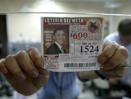 A woman displays a lottery ticket with a photograph of US Democratic presidential nominee Senator Barack Obama (D-IL) in Medellin October 23, 2008. After trailing by 10 points in US rural areas, Democrat Barack Obama is neck-and-neck with Republican John McCain among rural voters in 13 swing states, a potentially key group for winning the White House, according to a poll released on Thursday. [Agencies]
