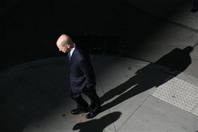 In this Oct. 2, 2008 file photo, a man walks to work on Wall St. Thursday, Oct. 2, 2008 in New York. Many Wall Street bankers and brokers are already scrambling to relocate their families, possessions and rarified talent to far-flung venues including Florida, Chicago, Milwaukee, Virginia, and Asia to find a job and get out from under an avalanche of layoffs. [Agencies]