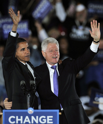 US Democratic presidential nominee Senator Barack Obama and former President Bill Clinton (R) wave during an Obama campaign rally in Kissimmee, Florida October 29, 2008. The event was the first time the two have campaigned together in person. [Agencies]