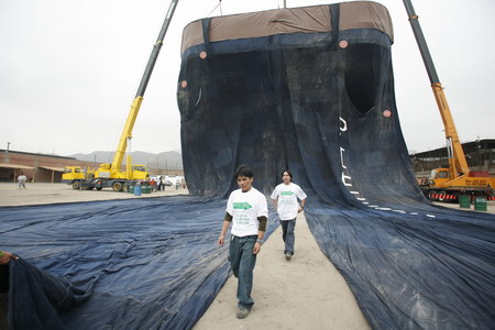 Workers walk near a large pair of jeans made in a factory in San Juan de Lurigancho in Lima October 30, 2008. Seamstresses in Peru, hoping to snag a spot in the Guinness Book of World Records, presented what they say is the world's largest pair of jeans on Thursday, complete with back pockets, buttons and a belt. Cranes lifted the enormous pair onto a giant metal made to model the pants, which measure 40 meters (131 ft) tall, 30 meters (98 ft) wide and weigh more than 2 tonnes. The jeans were cut from some 3,000 meters (9,842 feet) of cloth. [Agencies]