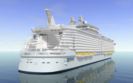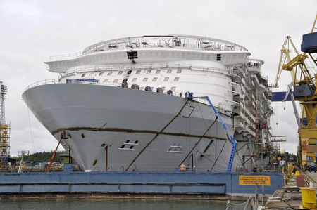 Cruise ship Oasis of the Sea under construction at the Aker Yards in Turku, Finland. Built for Royal Caribbean International, when she launches in November 2009, Oasis of the Seas will be the largest and most revolutionary cruise ship in the world. She will span 16 decks, encompass 220,000 gross registered tons (GRT), carry 5,400 guests and feature 2,700 staterooms. Oasis of the Seas will be the first ship to tout the cruise liner's new neighborhood concept of seven distinct themed areas, which include Central Park, Boardwalk, the Royal Promenade, the Pool and Sports Zone, Vitality at Sea Spa and Fitness Center, Entertainment Place and Youth Zone. The ship will sail from her home port of Port Everglades in Fort Lauderdale in Florida. In 2010, she will be joined by a sister ship, Allure of the Seas. [CFP]