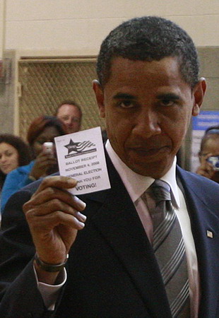 US Democratic presidential nominee Senator Barack Obama (D-IL) shows an electronic receipt that showed he voted in the US presidential election at the Beulah Shoesmith Elementary School in Chicago, November 4, 2008. [Agencies]