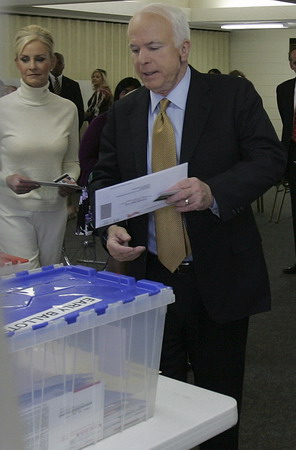 US Republican presidential nominee Senator John McCain (R-AZ) drops his ballot into the ballot box alongside his wife, Cindy (L), at his polling place in Phoenix, November 4, 2008. [Agencies]
