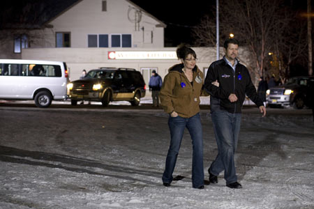 US Republican vice presidential nominee Alaska Gov. Sarah Palin leaves the polling station at Wasilla City Hall with husband, Todd, after casting her vote in Wasilla, Alaska, November 4, 2008.[Agencies]