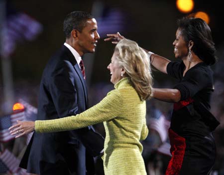 U.S. President-elect Senator Barack Obama (D-IL) gets a hug from his wife Michelle (R) as Jill Biden (C) approaches her husband Vice President-elect Joe Biden (D-DE), following Obama's speech during his election night rally after being declared the winner of the 2008 U.S. Presidential Campaign in Chicago November 4, 2008.[Agencies]