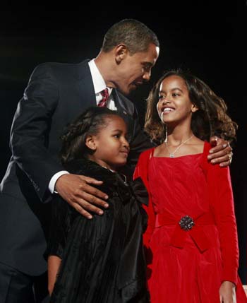 U.S. President-elect Senator Barack Obama (D-IL) embraces his daughters Sasha (C) and Malia (R) during his election night rally in Chicago November 4, 2008.[Agencies]