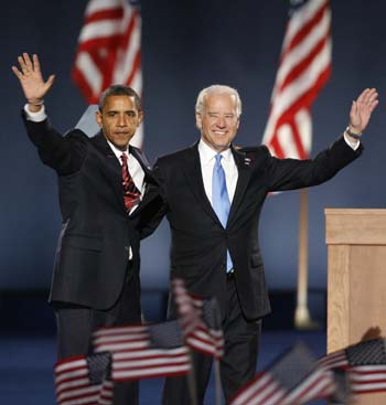 U.S. President-elect Senator Barack Obama (D-IL) (L) and U.S. Vice-president-elect Senator Joseph Biden (D-DE) wave after Obama's speech on stage during their election night rally in Chicago November 4, 2008.[Agencies]