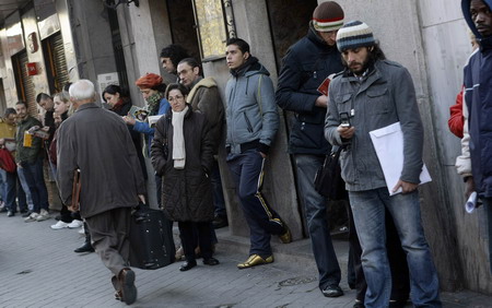People queue outside a government job centre in Madrid November 6, 2008. The number of Spaniards out of work leapt to a 12-year high in October, marking the worst level in the euro zone, as financial market turmoil hit Spain's labour market harder than any other in the currency bloc. [Agencies]