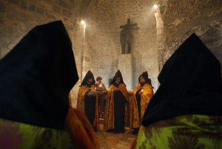 Armenian clerics take part in the Feast of the Cross, a ceremony in which the Armenian community commemorates what it believes was the fourth century discovery of the cross upon which Jesus was crucified, in Jerusalem's Old City November 9, 2008. Greek Orthodox and Armenian worshippers traded blows on Sunday in the Church of the Holy Sepulchre, where Christian sects jealously protect their hold over sections of the traditional site of Jesus' crucifixion. [Agencies]