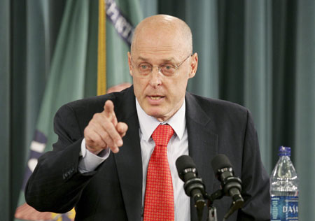 US Treasury Secretary Henry Paulson speaks during a news conference at the Treasury Building in Washington November 12, 2008. Paulson on Wednesday said he was backing away from buying troubled mortgage assets using a US$700 billion bailout fund, instead favoring a second round of capital injections into financial institutions that would match private funds. [Agencies]