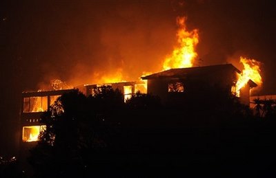 A mansion burns during a wildfire, Friday, Nov. 14, 2008, in Santa Barbara, Calif. An official in Santa Barbara County, says the fire has destroyed about 70 homes in the upscale community of Montecito. [Agencies]