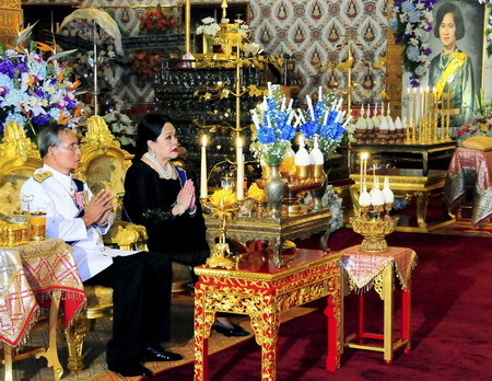 Thai King Bhumibol Adulyadej and Queen Sirikit take part in religious rites for the king's late elder sister Princess Galyani Vadhana at the Grand Palace in Bangkok November 14, 2008. Hundreds of thousands of Thais are expected to take part in Princess Galyani's cremation ceremony, scheduled from November 14 to 19. [Agencies]