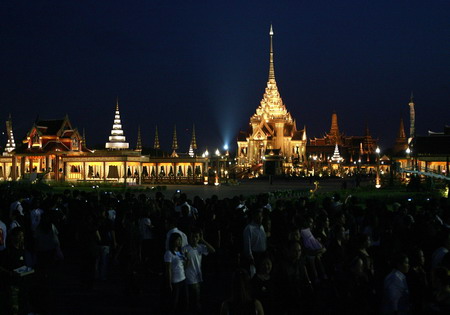 The royal funeral pyre for Thai King Bhumibol Adulyadej's late sister Princess Galyani Vadhana is seen in front of the Royal Palace and Wat Phra Kaew (Temple of the Emerald Buddha) in Bangkok on November 14, 2008. Hundreds of thousands of Thais are expected to take part in Princess Galyani's cremation ceremony, scheduled from November 14 to 19. [Agencies]
