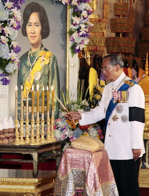 Thai King Bhumibol Adulyadej lights candles as he attends religious rites for his late elder sister Princess Galyani Vadhana at the Grand Palace in Bangkok November 14, 2008. Hundreds of thousands of Thais are expected to take part in Princess Galyani's cremation ceremony, scheduled from November 14 to 19. [Agencies]