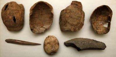 Archeological artifacts, discovered in a cave in the lower Galilee region of northern Israel, are displayed at Hebrew University in Jerusalem November 4, 2008. An ancient grave unearthed in modern-day Israel containing 50 tortoise shells, a human foot and body parts from numerous animals is likely one of the earliest known shaman burial sites, researchers said on Monday. [Agencies]