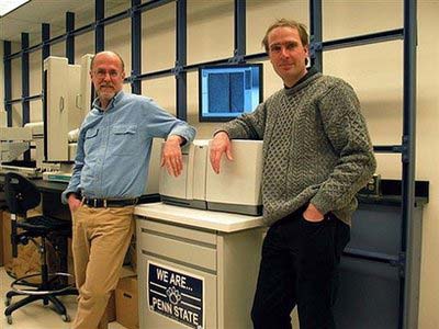 This Penn State University handout photo obtained in 2007 shows Penn State University genomicists Webb Miller (L) and Stephan C. Schuster, in front a machine that was used to sequence mammoth mitochondrial DNA from the hair of 10 woolly mammoths. Scientists said had reconstructed around half of the genome of the woolly mammoth. [Agencies]
