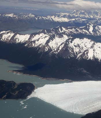 An aerial view shows part of the "Perito Moreno" glacier in the Los Glaciares National Park in the south west of Santa Cruz province, Argentina, November 19, 2008. Perito Moreno is one of 48 glaciers fed by the Southern Patagonian Ice Field located in the Andes system shared with Chile. This ice field is the world's third largest reserve of fresh water. Picture taken November 19, 2008. [Agencies]