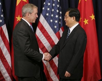 Chinese President Hu Jintao (R) and US President George W. Bush shake hands before their meeting at the APEC Summit in Lima, Peru, Friday, Nov. 21, 2008. [Agencies]