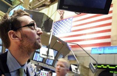 A giant American flag is reflected in the glasses of trader Bradley Silverman as he works on the floor of the New York Stock Excahnge, Friday, Nov. 21, 2008. [Agencies]