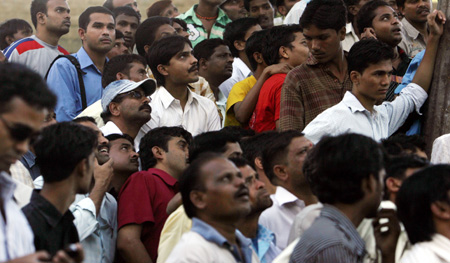 Onlookers stand outside Taj Hotel in Mumbai November 27, 2008. Elite Indian commandos fought room to room battles with Islamist militants inside two luxury hotels to save scores of people trapped or taken hostage, as the country's prime minister blamed neighbouring countries. [Agencies]