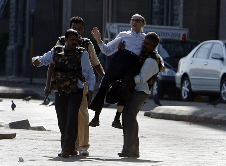 Police escort a stranded guest from Taj hotel in Mumbai November 27, 2008. Elite Indian commandos fought room-to-room battles with Islamist militants inside two luxury hotels to save scores of people trapped or taken hostage, as the country's Prime Minister Manmohan Singh blamed neighbouring countries. [Agencies]