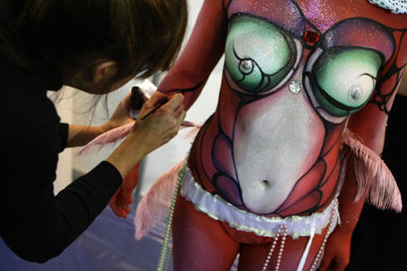 An artist applies paint on a model during a body painting contest in central Madrid November 28, 2008. [Agencies]