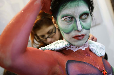 An artist applies paint on a model during a body painting contest in central Madrid November 28, 2008. [Agencies]