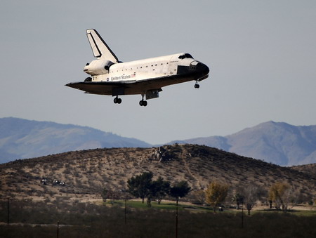 The US space shuttle Endeavour approaches Edwards Air Force Base in California November 30, 2008. The orbiter touched down at Edwards Air Force Base after being diverted from NASA's Kennedy Space Center due to weather concerns. [Agencies]