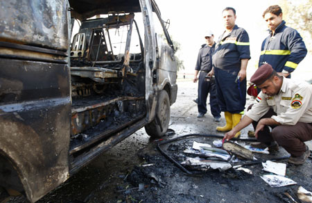 Updated: 2008-12-01 23:11 ![]() A police officer inspects documents found at a burnt vehicle after bomb attacks at a police academy in eastern Baghdad December 1, 2008. An apparently coordinated car bomb and suicide bomb attack at Baghdad's police academy killed at least 30 people on Monday, police said. [Agencies]