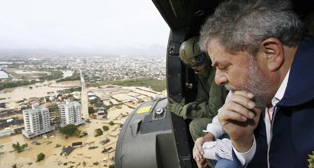 "We're only asking God to stop the rains soon so that we can start to rebuild the state of Santa Catarina," he said. Thirty-one people are still missing, and some officials have estimated the death count could rise to as much as 150. About 80,000 people were forced from their homes by storms that dumped more water on the region during the weekend of Nov. 22-23 than it normally gets in months. Another 8,000 people were displaced in neighboring Rio de Janeiro state. Silva said the government may let people take money from their mandatory unemployment accounts to rebuild homes and businesses destroyed by mudslides, and said state-owned Banco do Brasil SA may offer special loans for farmers hit hard by the floods. He also called for a study on the causes of the tragedy, saying that heavy rains alone should not have been able to cause such devastation. The aid comes up top of programs announced last week for 2 billion reals ($830 million) in government emergency aid and 1.5 billion reals ($650 million) in loans from the government-owned bank Caixa Economica Federal for people and businesses in the disaster zone. Almost all Brazilians have the unemployment accounts that receive contributions from workers and employers. Brazilians are allowed to use money from the accounts to buy a first home. Silva did not specify how the government would allow flood victims to use the money or describe amounts that victims could withdraw. Forecasters said intermittent rains should end on Thursday. |