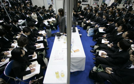 Job-seekers listen to company employees giving speech at booths at a job fair held for graduates in Tokyo November 15, 2008. University students in the world's second-largest economy could face a rude awakening as the global financial crisis hits Japan, prompting firms to cut graduate recruitment. [Agencies]