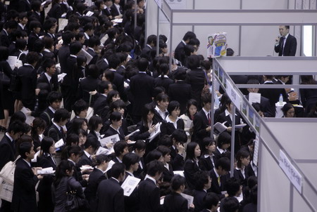 Job-seekers visit booths of companies at a job fair held for graduates in Tokyo November 15, 2008. University students in the world's second-largest economy could face a rude awakening as the global financial crisis hits Japan, prompting firms to cut graduate recruitment. [Agencies]