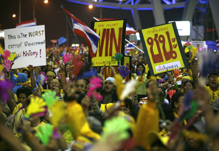 The rulings raised the risk of clashes between red-shirted government allies, who rallied outside the court as the verdict was read out, and thousands of the yellow-shirted anti-government protesters blockading the capital's two airports. There was no immediate reaction to the court verdict from the People's Alliance for Democracy (PAD), who invaded Bangkok's two main airports last week in a "final battle" to topple Somchai. The PAD had refused to negotiate until Somchai was gone. They accuse Somchai of being a puppet of his brother-in-law, ousted Prime Minister Thaksin Shinawatra. Around 250,000 foreign tourists have been stranded by the week-long sit-ins at Don Muang and the bigger Suvarnabhumi international airport. The air cargo industry has ground to a halt, costing the country hundreds of millions of dollars. However, airport officials said they hoped to resume cargo flights from Suvarnabhumi later on Tuesday, a welcome sight for a tourist- and export-dependent economy already suffering from the global financial crisis.