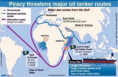 Major shipping routes for oil tankers from the Gulf. An Indian warship destroyed a pirate vessel in the Gulf of Aden, as bandits demanded a ransom for a Saudi super-tanker. [Agencies]